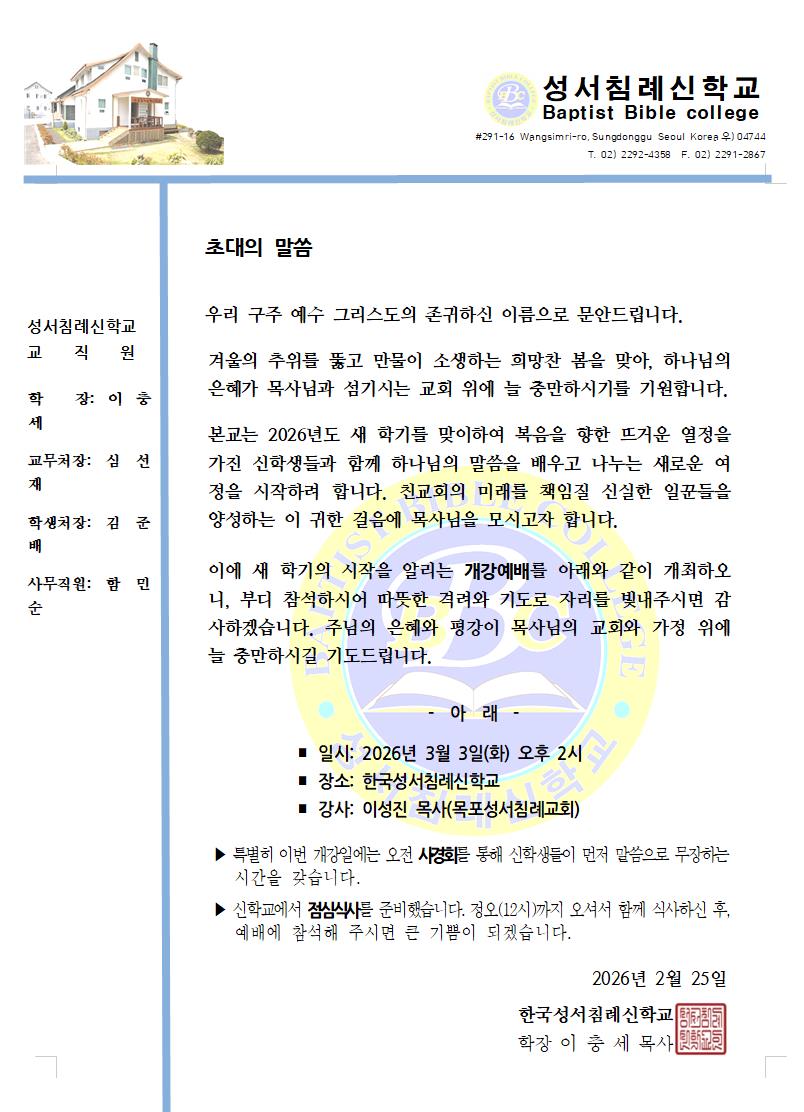 본교는 2026년도 새 학기를 맞이하여 복음을 향한 뜨거운 열정을 가진 신학생들과 함께 하나님의 말씀을 배우고 나누는 새로운 여정을 시작하려 합니다. 친교회의 미래를 책임질 신실한 일꾼들을 양성하는 이 귀한 걸음에 목사님을 모시고자 합니다.